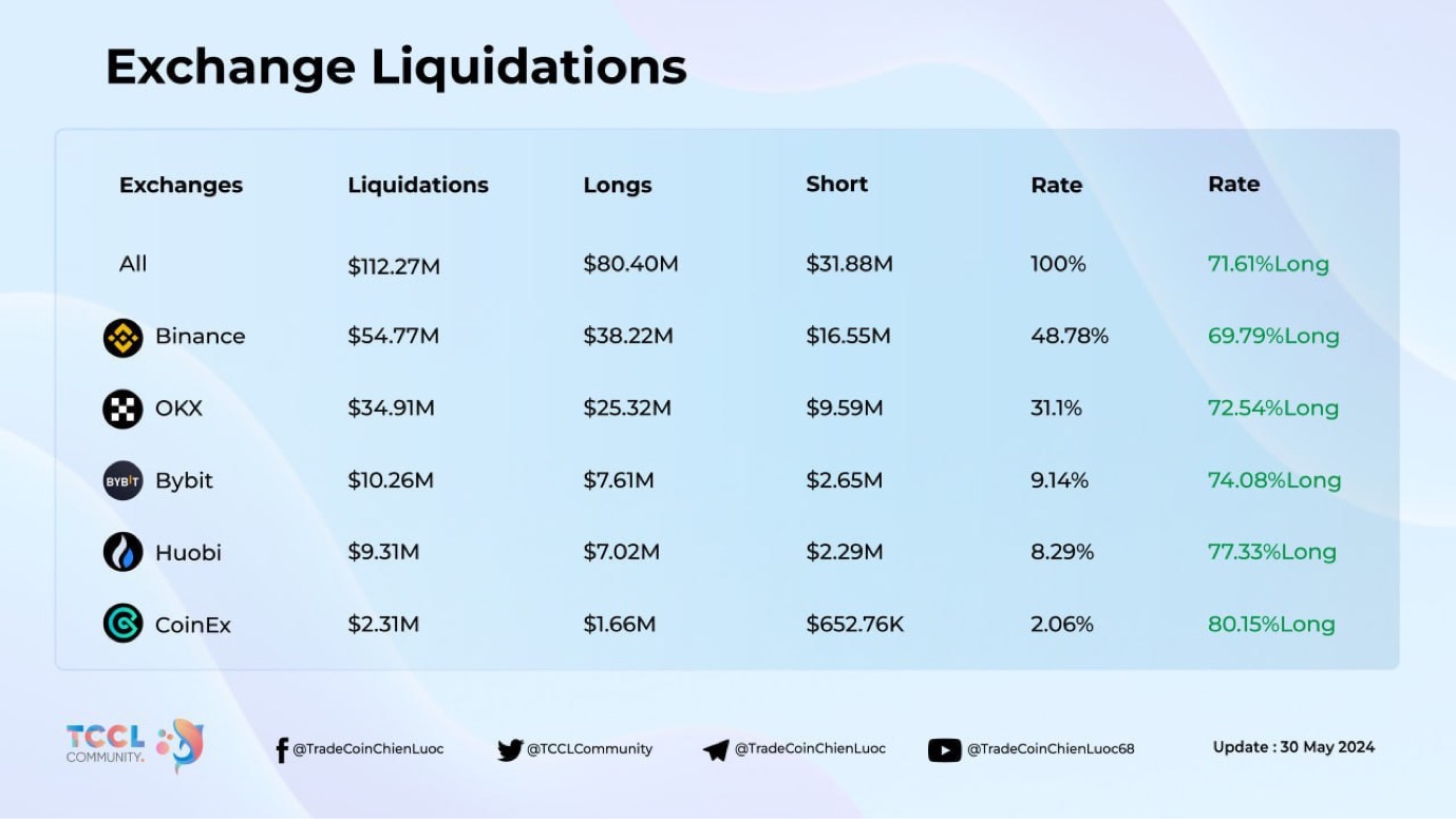 Trong 24 giờ qua, 52.187 bị thanh lý, tổng số tiền thanh lý là 112.27 triệu USD. Các mã bị thanh lý hàng đầu gồm: BTC, ETH, NOT,…