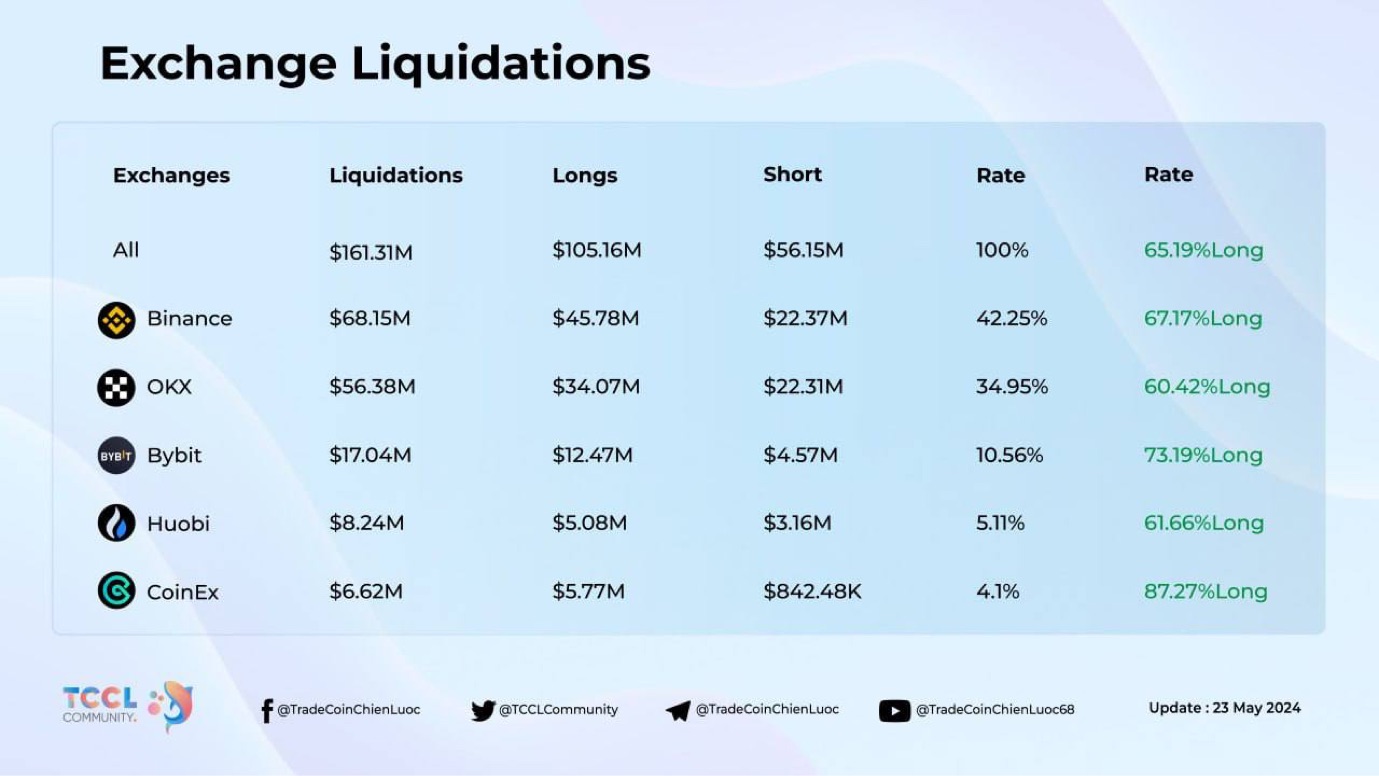 Trong 24 giờ qua, 62.649 bị thanh lý, tổng số tiền thanh lý là 161.31 triệu USD. Các mã bị thanh lý hàng đầu gồm: ETH, BTC, PEPE,…