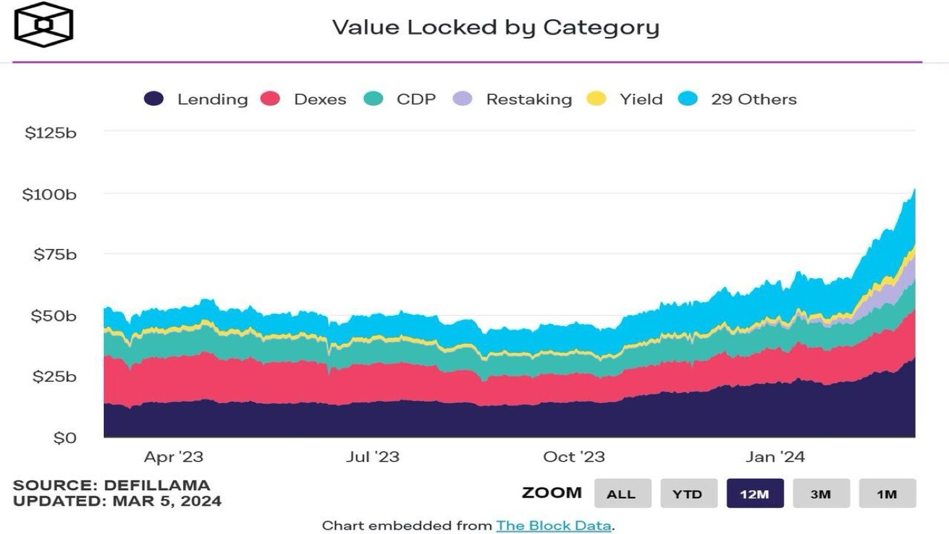 Vào ngày 5 tháng 3, TVL của DeFi đã đạt 101,36 tỷ USD, trong đó lending chiếm 32,62 tỷ USD (32,2%), sàn giao dịch phi tập trung chiếm 19,97 tỷ USD (19,7%), collateralized debt positions là 12,22 tỷ USD (12%) và các hoạt động restaking là 10,06 tỷ USD (9,9%).