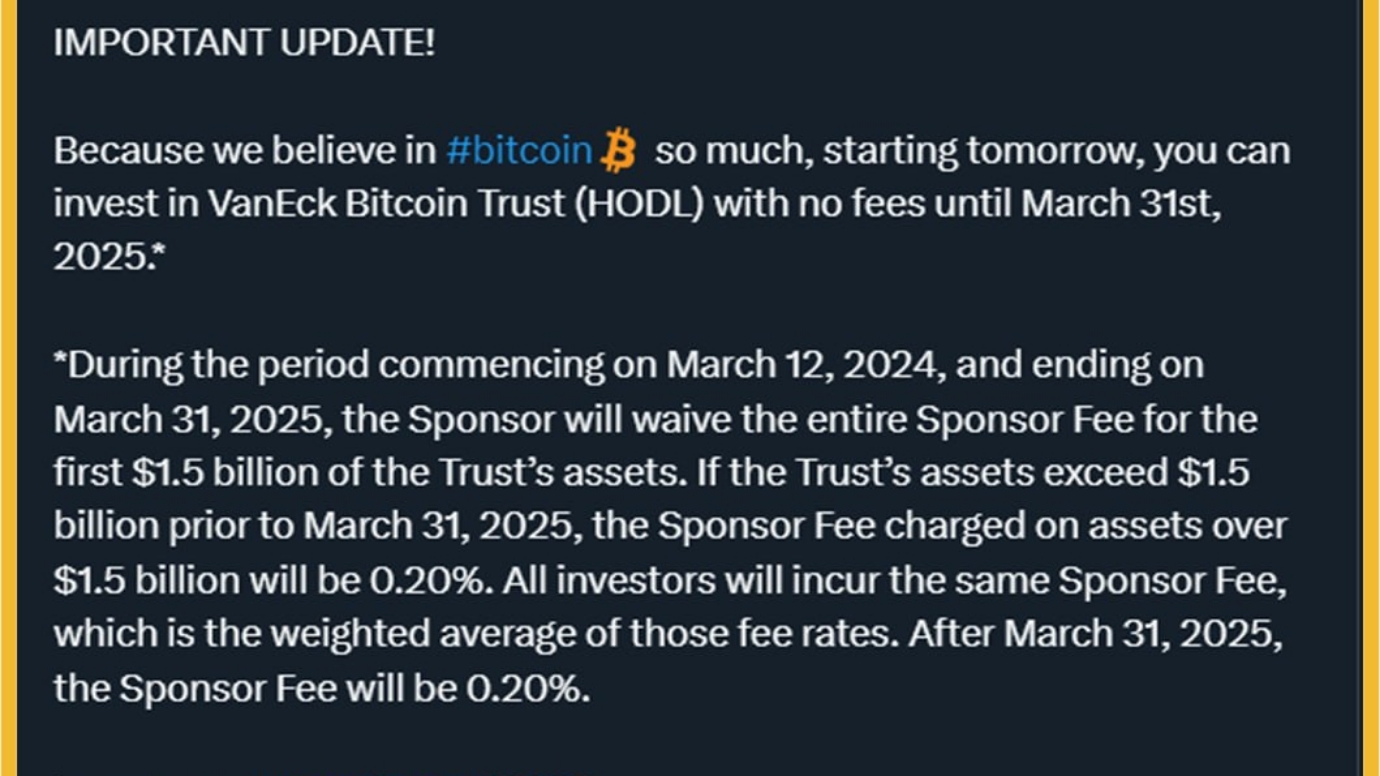 – Từ ngày mai 12/03 đến ngày 31/03/2025, VanEck sẽ miễn toàn bộ Phí tài trợ cho 1.5 tỷ USD tài sản đầu tiên rót vào Quỹ ETF